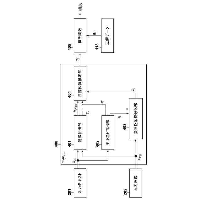 入力データと正解データとを含む教師データを取得する取得手段であって、前記入力データは、参照物体を含む入力画像と、前記参照物体を参照して目標位置を相対的に指定する入力テキストと、を含む、取得手段と、