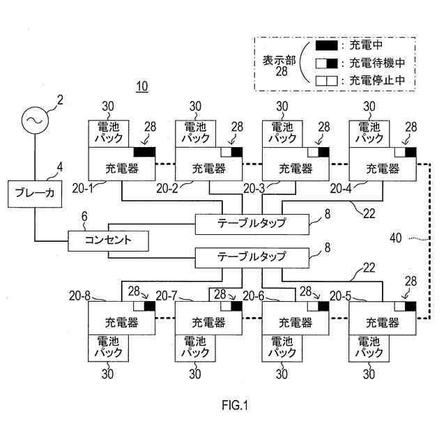 これに対し、日本における一般家庭用コンセントの定格電流は15Aであり、1つのブレーカからコンセントに供給可能な電流は20Aである。このため、1つのブレーカから電力供給を受けるコンセントに上記充電器を複数台接続し、そのうちの2台以上の充電器で電池パックへの充電を実施すると、ブレーカがオフしてしまう。この結果、各充電器への電力供給が遮断され、全ての充電器で電池パックへの充電を実施することができなくなる。