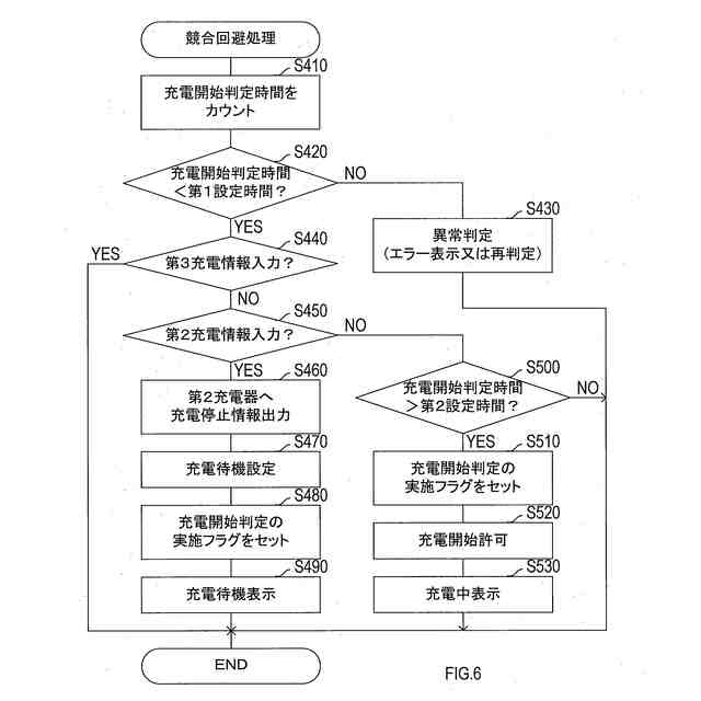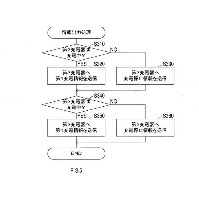 その後、所定時間が経過する間に前記通信部が前記第2充電情報を受信したか否かを判定し、前記所定時間が経過する間に前記通信部が前記第2充電情報を受信すると、前記通信部から前記第2充電器に対し、当該充電器が充電停止状態であることを表す充電停止情報を送信させる、