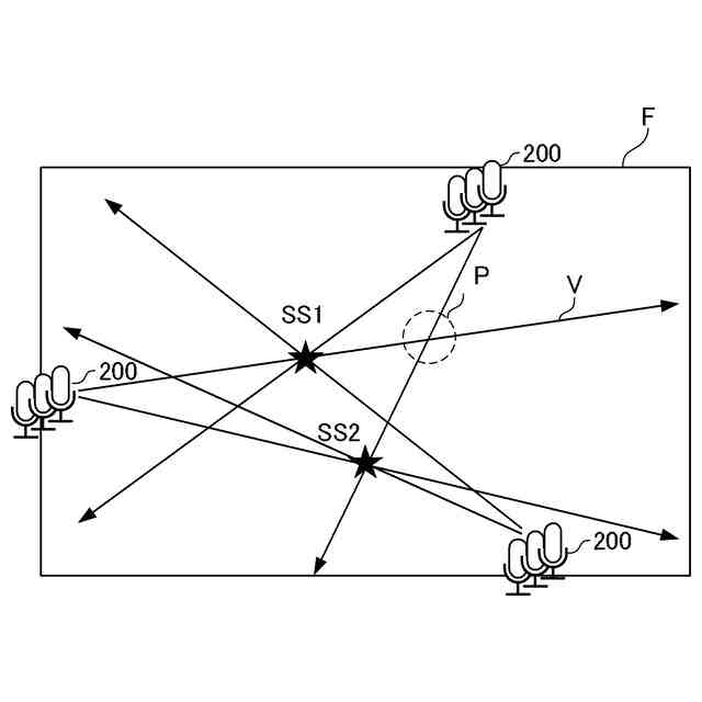 しかし、この手法では、各マイクロホンアレイ200において別の音源から受音されることによるベクトルの交点Pも検出される。この交点Pは音源推定とは関係がないものの、そのままでは音源位置を示す交点と区別することができない。