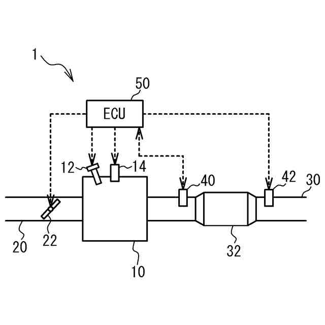 図1は、エンジンシステム1の概略構成図である。エンジンシステム1は、エンジン10、吸気通路20、及び排気通路30を有する。エンジンシステム1は、車両に搭載されている。車両は、例えば走行動力源としてエンジン10のみが搭載されたエンジン車両であってもよいし、走行動力源としてエンジン10と共にモータを備えたハイブリッド車両であってもよい。