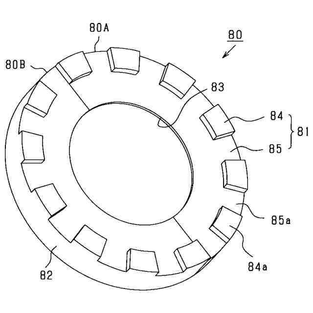 前記検出対象部は、前記フランジ部に対して前記軸線方向に突出する凸部(584)と、前記軸線方向において前記凸部に対して前記フランジ部側に凹む凹部(585)とが前記周方向において交互に設けられた構成になっており、