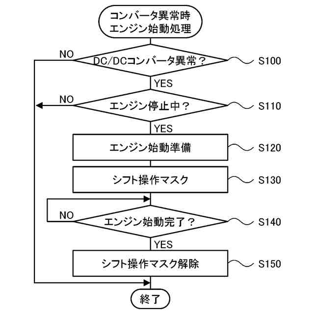 【解決手段】高電圧系電力ラインの電力を降圧して低電圧系電力ラインに供給する電力変換装置に異常が生じているときに低電圧系電力ラインから電力の供給を受けるスタータモータを用いてエンジンを始動するときには、エンジンの始動が完了するまでシフト操作をマスクする。