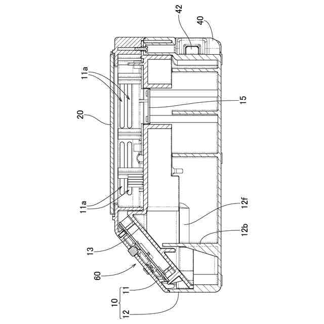 前記バッテリーが、前記筐体内の制御部と少なくとも電気的に接続可能に配置される接点部を有し、筐体に対し、平面視において筐体の存在する領域に前記接点部が重なることを