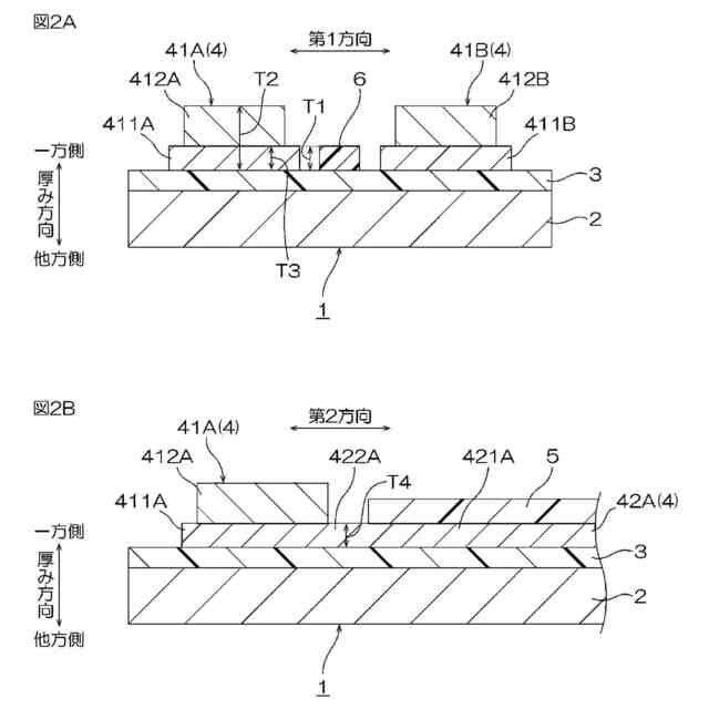 本発明[2]は、前記回路パターンが、前記第2端子に接続される第2配線をさらに有し、前記第2配線が、前記第2絶縁層によって覆われる第2本体部と、前記第2端子と前記第2本体部との間に配置され前記第2絶縁層から露出する第2露出部と、を有し、前記第3絶縁層が、前記第1露出部と前記第2露出部との間に配置される、上記[1]の配線回路基板を含む。