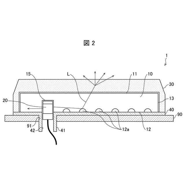 上記の構成によれば、光源を発光領域の外側に配置するための、発光しない余分な構造物を設ける必要がなくなる。したがって、意匠の見栄えを向上させることができる。