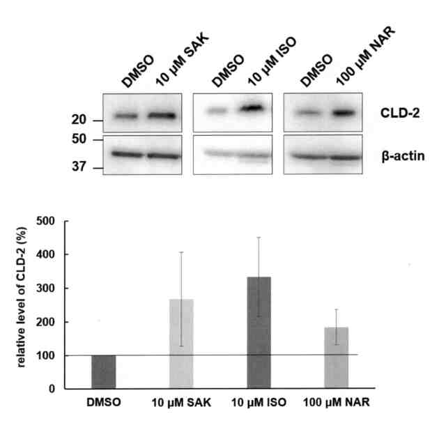 図2は、実施例1において、10μM SAK、10μM ISO、100μM NARを細胞に添加した際のウエスタンブロットの結果を示す写真およびクローディン2(CLD-2)タンパク質の発現量を示すグラフである。