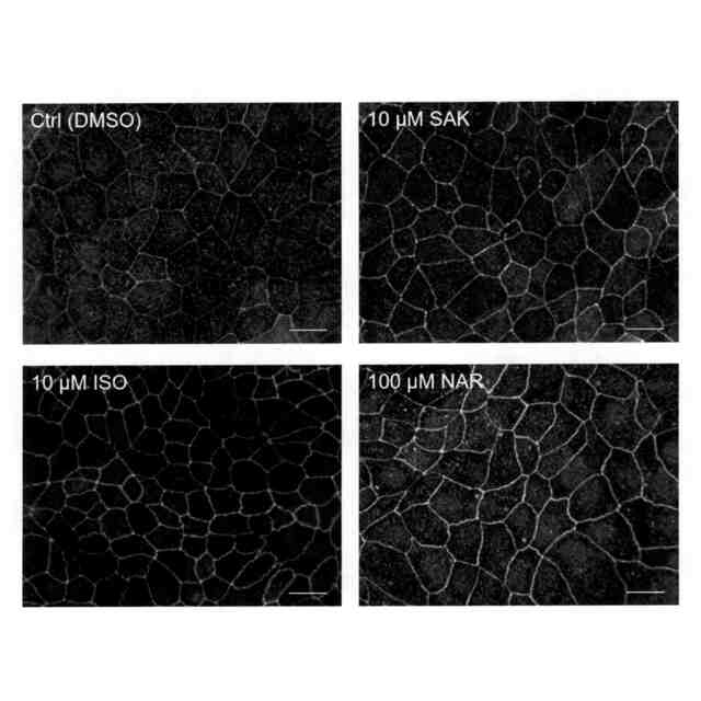 図1は、実施例1において、10μM SAK、10μM ISO、100μM NARを細胞に添加した際の免疫染色の結果を示す写真である。