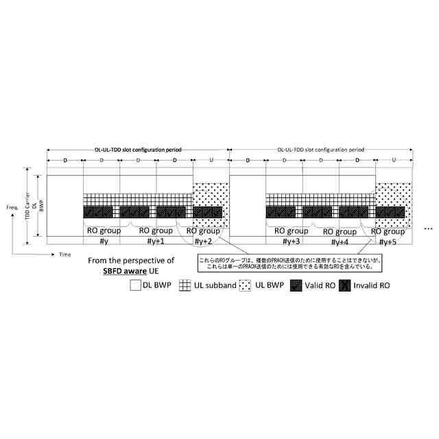 [0006] UEとしても知られる現代の通信機器(例えば、移動電話機、車両、ラップトップ、衛星、及びこれに類するもの)は、ネットワーク・ノードに関連付けられたネットワークからデータを受信するために、及び、ネットワークノードに関連付けられたネットワークへデータを送信するために、ネットワーク・ノード(例えば、gNB)と通信することが可能である。複数のPRACH送信がある場合、ROグループを構築するためにレガシー手法を適用すると、問題を生じる可能性がある。例えば、ROグループが、SBFDシンボルにおけるROとnon-SBFDシンボルにおけるROとを含む場合に、gNBは、異なるアンテナ構成を使用して、PRACH送信の非効率的な受信を引き起こす可能性がある。更に、ROグループを形成するための開始点が相違するので、ROグループの開始は、レガシーUEとSBFD対応UE(SBFD-aware UE)との間で整列していない可能性がある。これは、gNBにおけるブラインド検出の複雑性を増やしてしまう。従って、SBFD動作を強化するためのROグループを構築する方法が望まれる。