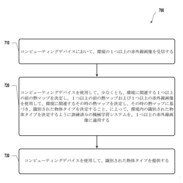 第3の態様では、コンピューティングデバイスが提供される。コンピューティングデバイスは、1つ以上のプロセッサおよびデータ記憶域を含む。データ記憶域には、1つ以上のプロセッサによって実行されると、コンピューティングデバイスに、動作を行わせる、コンピュータ実行可能命令が格納されている。この動作には、環境から撮影された1つ以上の赤外線画像を受信することが含まれる。この動作には、環境内の識別された物体タイプを決定するように訓練済みの機械学習システムを1つ以上の赤外線画像に適用することも含まれる。訓練済み機械学習システムを適用することには、環境に関連する1つ以上の前の熱マップを決定することが含まれる。訓練済み機械学習システムを適用することは、1つ以上の前の熱マップおよび1つ以上の赤外線画像を使用して、環境に関連するその時の熱マップを決定し、その時の熱マップに基づいて、識別された物体タイプを決定することも含まれる。この動作には、識別された物体タイプを提供することがさらに含まれる。