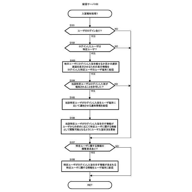 非特許文献1のような仮想空間に、ユーザのうちファン活動の応援対象であるタレントなどの特定ユーザが入室すれば、ファンユーザも同じ仮想空間に後を追って入室を試みる傾向にある。また、事前予告なく突然仮想空間内において特定ユーザがイベントを始める場合もある。そのため、いち早く特定ユーザが入室した情報を入手できれば、ファン活動がより充実したものとなる。