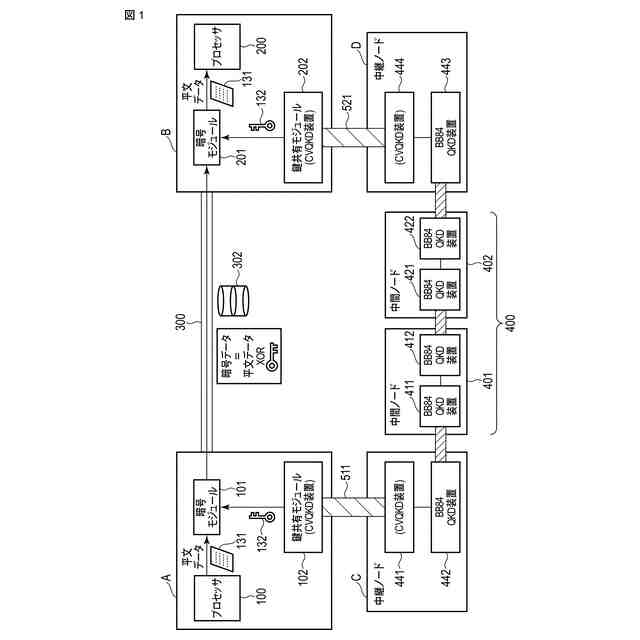 【解決手段】ユーザ拠点は、暗号データを送信するための暗号モジュールと、前記暗号データを生成するのに使用された暗号鍵を復元及び分散する機能を有した鍵共有モジュールとを備える。前記鍵共有モジュールは、前記暗号鍵を分散した複数の乱数鍵を、それぞれ異なる経路で配送するために、複数のCVQKD装置を有し、この複数のCVQKD装置は、前記異なる経路のそれぞれの設けられた中継ノード内のCVQKD装置に量子接続しており、さらに前記複数のCVQKD装置は、前記暗号鍵の分散と、分散された暗号鍵の復元を行うために、暗号鍵の分散/復元回路と接続している。