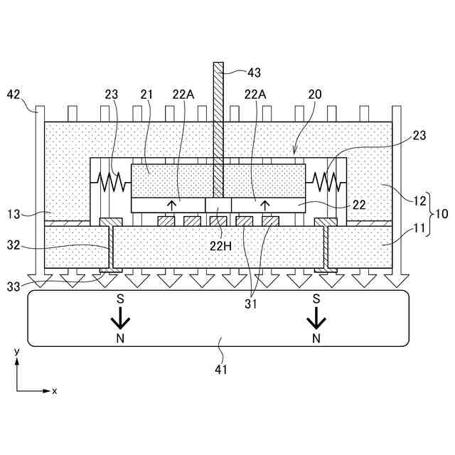 本発明において、複数の磁化領域を有する硬磁性体は収容体に弾性支持されていても構わない。これによれば、アクチュエータやエネルギハーベスタなど可動部を有する磁気デバイスを構成することが可能となる。この場合、複数の磁化領域を有する硬磁性体は、収容体に弾性支持された第1の硬磁性体からなる磁化領域と、第1の硬磁性体とは独立して収容体に弾性支持された第2の硬磁性体からなる磁化領域とを含んでいても構わない。