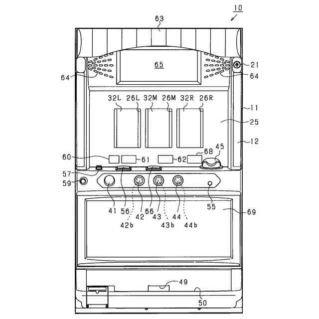 以下、遊技機の一種である回胴式遊技機、具体的にはスロットマシンに適用した場合の一実施の形態を、図面に基づいて詳細に説明する。図1はスロットマシン10の正面図、図2はスロットマシン10の前面扉12を閉じた状態の斜視図、図3はスロットマシン10の前面扉12を開いた状態の斜視図、図4は前面扉12の背面図、図5は筐体11の正面図である。