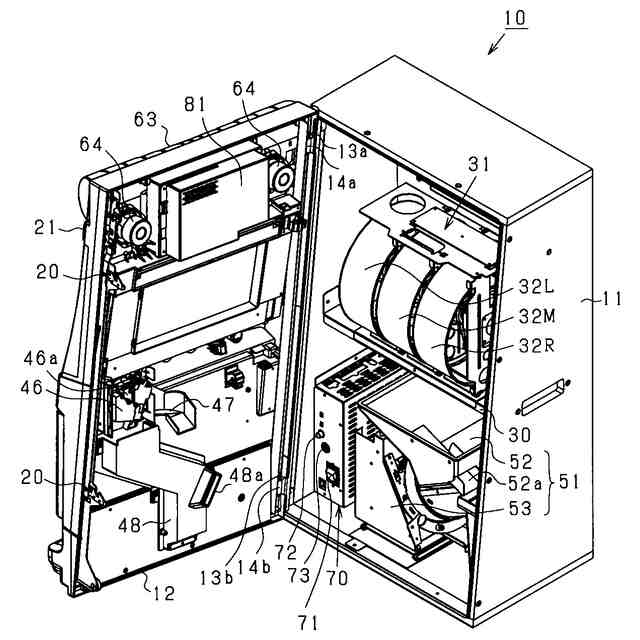 前面扉を開いた状態を示すスロットマシンの斜視図である。