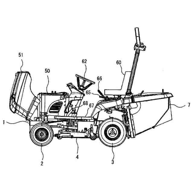 図1に示すように、乗用芝刈り機等の作業車両は、走行車体1と、走行車体1の前部に左右一対の前輪2が設けられ、走行車体1の後部に左右一対の後輪3が設けられ、走行車体1の下側における前輪2と後輪3の間に芝等を刈取る作業機4が設けられている。また、走行車体1の上側の前部にボンネット部5が設けられ、ボンネット部5の後側には操縦者が搭乗する操縦部6が設けられ、操縦部6の後側には作業機4で刈取られた芝等を貯留する集草容器7が設けられている。