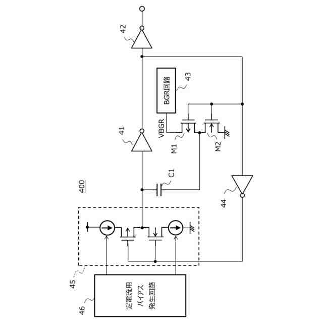 図4の発振回路400は、コンデンサC1と、インバーター41、42及び44と、バンドギャップ定電圧回路43(以降、BGR回路と称す)と、定電流源回路45と、定電流用バイアス発生回路46と、PMOSトランジスタM1と、NMOSトランジスタM2を備えている。