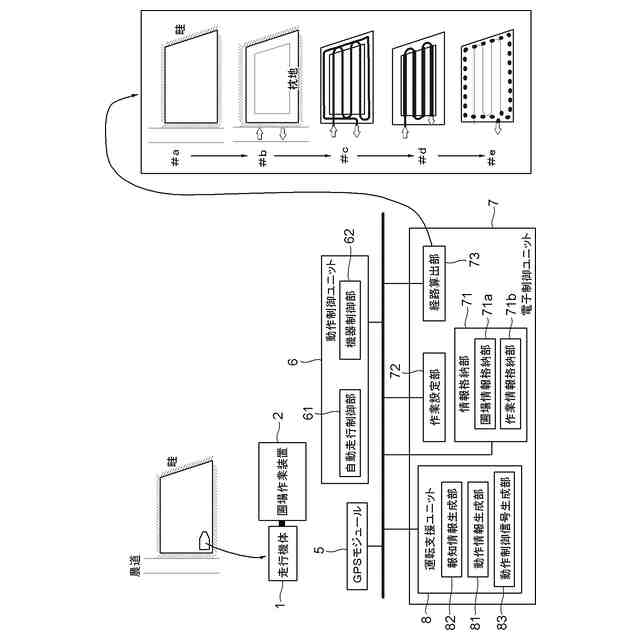 田植、播種、施肥などの圃場作業装置では、方向転換を伴う非作業走行時には、圃場作業装置の動作を停止させたり、その姿勢を非作業姿勢に変更したりする。このため、作業走行の終了点と開始点、言い換えると非作業走行の終了点と開始点では、圃場作業装置に対して何らかの操作を行わなければならない。この終了点と開始点のタイミングは、圃場作業において重要である。このため、本発明の好適な実施形態の1つでは、前記運転支援ユニットには、走行経路における前記圃場作業装置の作業開始動作点及び作業終了動作点を含む動作タイミング情報を生成する動作情報生成部が含まれている。そのような動作タイミング情報を運転者に報知し、その報知に基づいて運転者が必要な操作を行う実施形態においては、前記運転支援ユニットに、前記動作タイミング情報に基づいて運転者に動作タイミングを報知するための報知情報を生成する報知情報生成部が含まれている。また、そのような動作タイミング情報に基づく操作を自動的に行う実施形態においては、前記運転支援ユニットに、前記動作タイミング情報に基づいて前記圃場作業装置に対する動作制御信号を生成する動作制御信号生成部が含まれている。