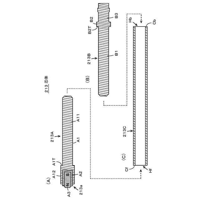 前記コイルが巻回されると共に、軸心方向に貫通孔を有する磁性体コアと、