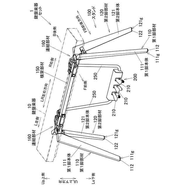 以下、本発明の実施形態を図に基づいて説明する。図1には、二点鎖線で示す略直方体形状の鍵盤楽器10を支持するスタンド100が示されている。鍵盤楽器セット1は、スタンド100と、スタンド100の上側に配置される鍵盤楽器10と、を備える。スタンド100には、3つのペダル210を備えるペダル装置200が設けられている。なお、以下の説明においては、ペダル210の前後方向(鍵盤楽器10の図示しない鍵の前後方向)を前後方向FBとして、前を前側F(演奏者側)、後を後側Bとし、ペダル210が配列する方向(鍵盤楽器10の図示しない鍵の配列方向)を左右方向LRとしてペダル装置200に向かって左を左側L、右を右側Rとする。また、ペダル装置200の上下方向ULにおいて上を上側Up、下を下側Loとする。なお、スタンド100が支持する対象は、本実施形態においては鍵盤楽器10としたが、他の楽器や、各種の装置等であってもよい。