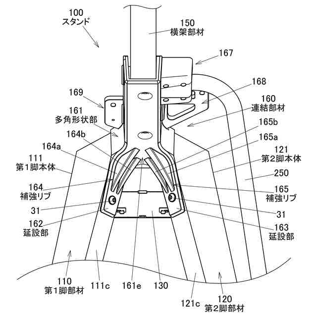 【解決手段】スタンド100は、横架部材150と、多角形状部161を含み横架部材150に設けられる連結部材160と、多角形状部161の第1面161aに固定される、水平方向の断面Saが長方形状の第1脚本体111を含む第1脚部材と、を含む。