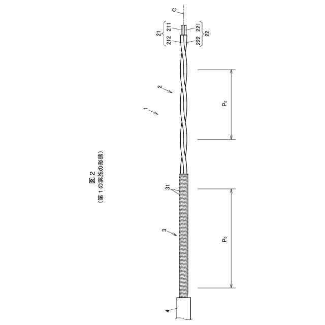 前記複数のシールド素線の横巻き方向において、前記複数のシールド素線のうち任意の一本のシールド素線が前記一対のコア線のうち一方のコア線の前記径方向の外径側の頂点に接してから他方のコア線に接するまでの角度が63.4°以下である、