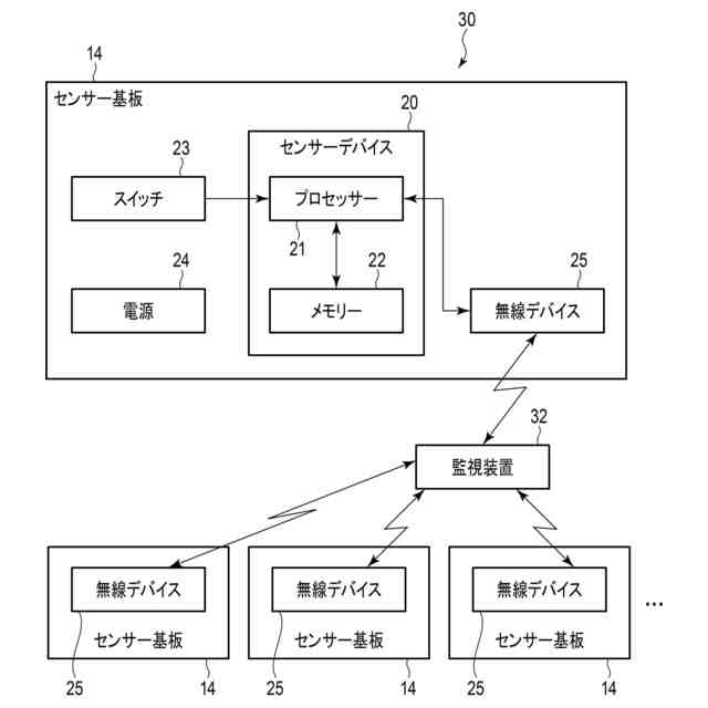 図3は、図2の着座検出装置のセンサー基板を監視装置に無線接続した着座監視システムのブロック図である。
