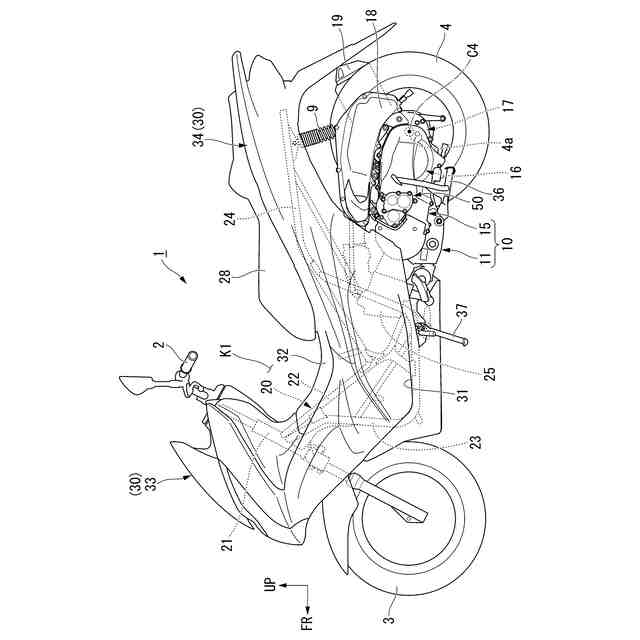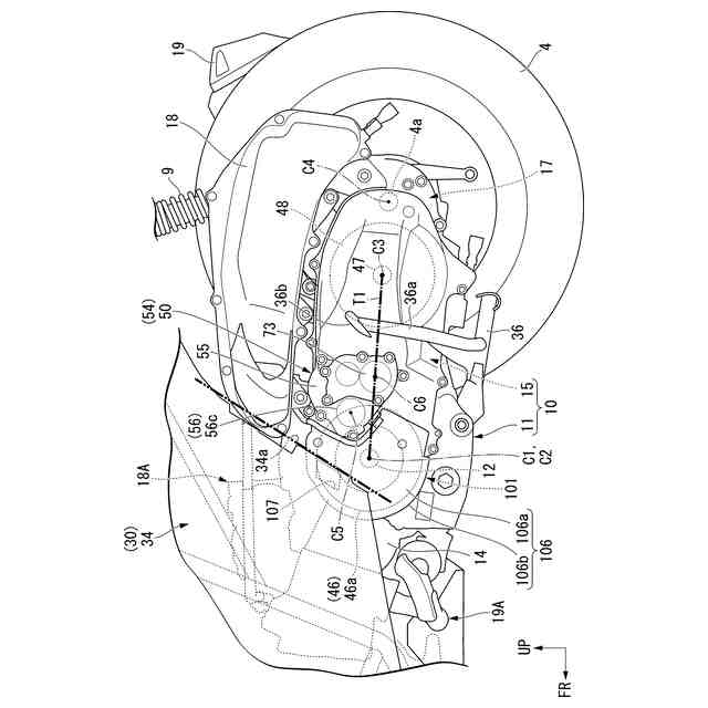 本発明の第三の態様は、上記第一又は第二の態様において、当該電動無段変速装置は、車体を左右にバンクさせてコーナーリングする鞍乗り型車両(1)に適用され、かつ両プーリー(46,48)の軸方向を車幅方向に沿わせて配置され、車幅方向から見て、駆動プーリー(46)の中心軸線(C2)と従動プーリー(48)の中心軸線(C3)とを結ぶ直線(T1)よりも上方に、モーター(56)の駆動軸(56a)が配置されている。