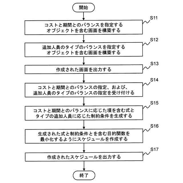 対象業務に含まれる各作業に配置する人員のコストの項と、与えられた制約のもとで前記人員を各作業に配置したときに前記対象業務が終了するまでの期間の項の値のバランスが指定された式を含む目的関数を最小化するスケジュールを作成し、