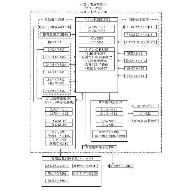 さらにまた、「管理装置(CRユニット)200」とは、遊技価値としての電子情報の貸出し及び払戻しの管理を行うための装置であり、遊技機1台ごとに設けられ、その遊技機に隣接して配置されるものである。ホールでは、管理装置200は、遊技機の間に配置されることから、サンドと称される。また、遊技機と、その遊技機に対応する管理装置200とから、「遊技システム」が構成される。
