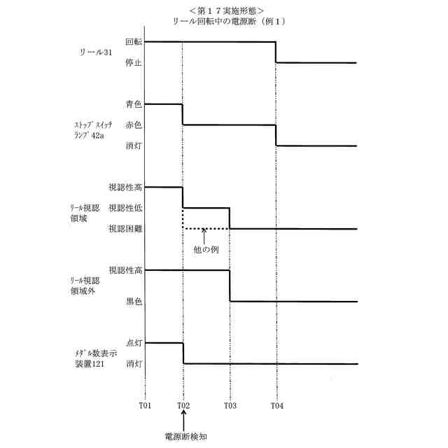 電源断が発生してストップスイッチランプの点灯色が第1の色から第2の色になったタイミングでは、リールが視認困難となっているように構成されている(図298中、他の例)