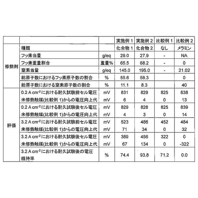 しかし、メラミン化合物が親水性であるため、メラミン化合物を修飾剤として用いた触媒を使用する際には、生成した水が触媒層内に滞留する。このため、反応物である酸素の輸送が阻害され、高電流密度領域での電圧が低下してしまう。また、特許文献3に開示されるような塩を用いた触媒においても、高電流密度領域での電圧低下の抑制について改善の余地があった。