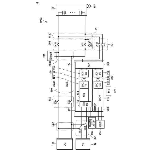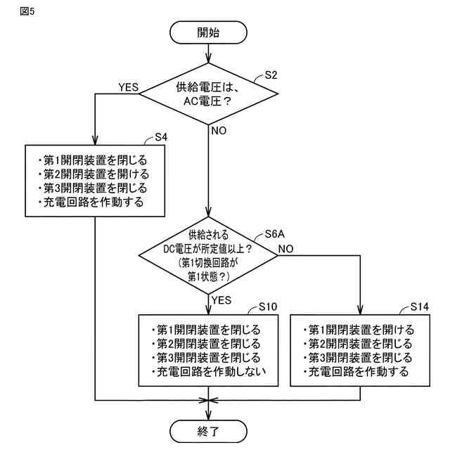 【解決手段】ECU320は、第1コネクタ111に供給される電圧がDC電圧である場合において、バッテリ106の電圧が所定値より高い場合に第1開閉装置301を閉じることにより、一対の第1電力線350からのDC電圧を補機DDC200に印加する。また、ECU320は、第1コネクタ111に供給される電圧がDC電圧である場合において、バッテリ106の電圧が所定値より低い場合に第1開閉装置301を開きかつPFC154と絶縁型DCDCコンバータ170との少なくとも一方を作動させることにより充電回路180で変圧された直流電圧を補機群108に印加する。