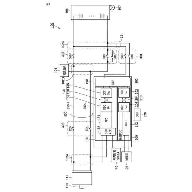 一般的に、電動車両は、車両の補機群を動作させるために、たとえば400Vのバッテリ電圧を14Vに降圧して供給する補機用DCDCコンバータを有する。補機群には、車両の制御のためのECU(Electronic Control Unit)、および充電用リレー、空調装置、バッテリ温調装置、およびオーディオ機器なども含まれる。補機群に含まれるこれらの装置は、バッテリの充電中にも動作が望まれる。つまり、電動車両においては、バッテリの充電中であっても補機群へ安定した電力を供給することが好ましい。