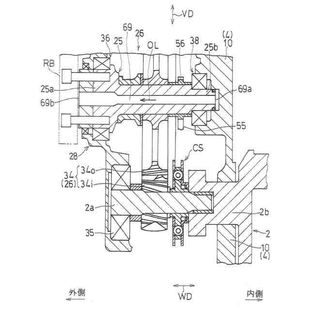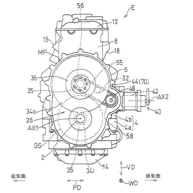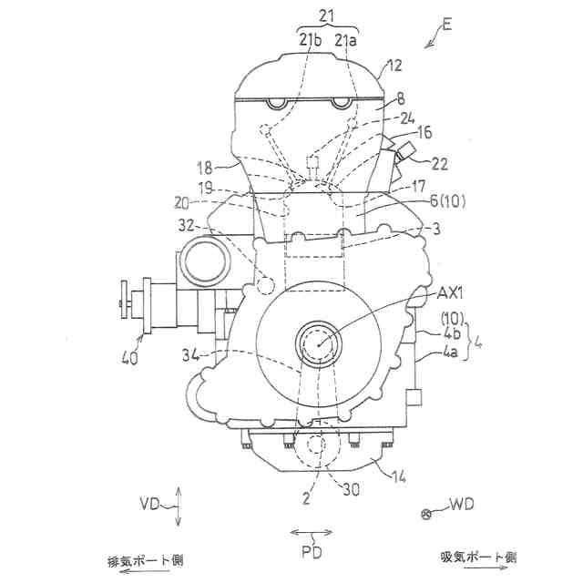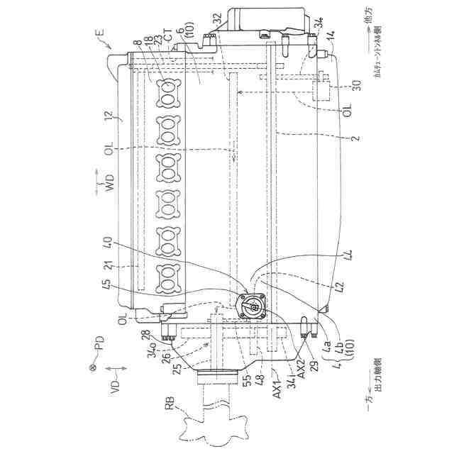 以下の説明において、「幅方向WD」とは、エンジンEのクランクシャフト2の延びる方向、すなわち、クランクシャフト2の軸心AX1方向をいう。幅方向WDにおいて、幅方向中心に向かう方向を「幅方向内方」といい、幅方向中心から離れる方向を「幅方向外方」という。「往復方向VD」とは、エンジンEのピストンの往復動方向をいう。「幅方向WD」と「往復方向VD」の両方に直交する方向を「直交方向PD」という。本実施形態では、飛行機に搭載された状態で、飛行機の胴体が延びる長尺方向に沿って幅方向WDが配置される。飛行機の長尺方向が水平に向く飛行状態においては、往復方向VDが鉛直方向、すなわち上下方向を向いた状態で、エンジンEが搭載されている。