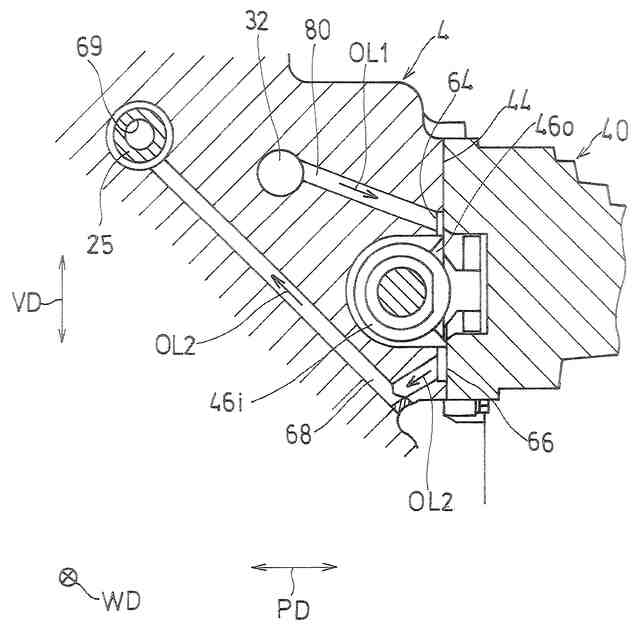 同ガバナのオイルの出入通路を示す縦断面図である。
