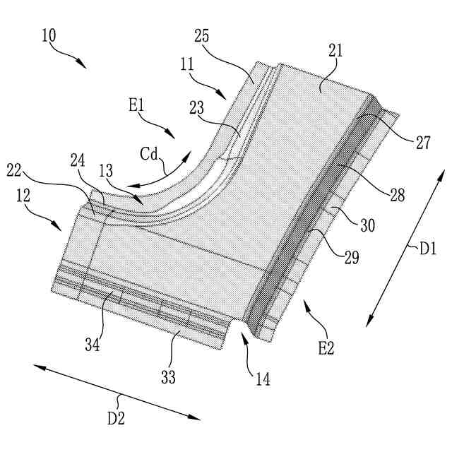 前記2つの直線部位のうち、少なくともいずれか一方の直線部位に設けられるとともに、前記天板部の幅方向における両端部のうち、前記湾曲部位が設けられた一端部とは反対側となる他端部で前記天板部に連続する外側縦壁部と、