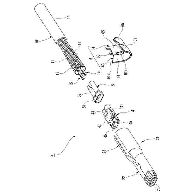 図7は、ケーブルの端末にインナーモジュールが接続される手順を説明する説明図であり、整合部品に挿通されたインナー端子がインナーハウジングのインナー端子収容部に収容された状態を示す。