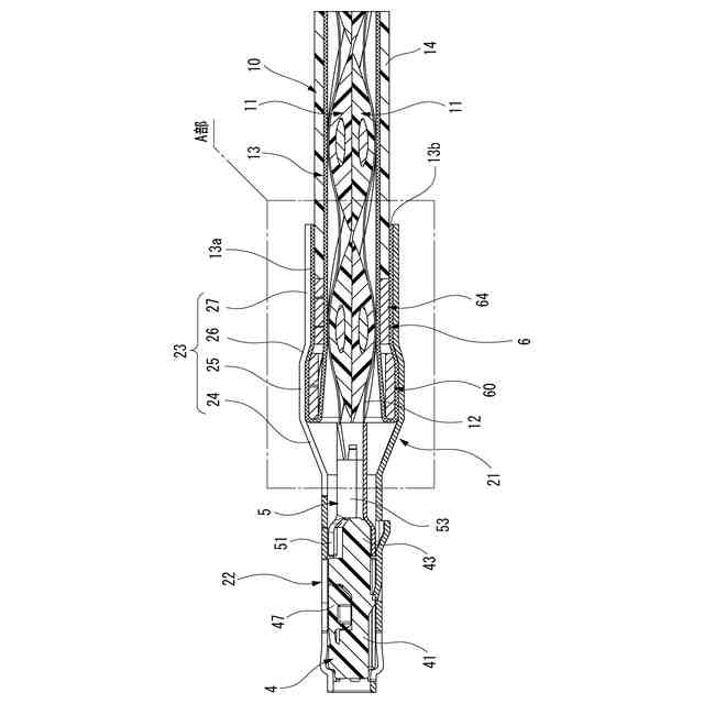 図6は、ケーブルの端末にインナーモジュールが接続される手順を説明する説明図であり、シースの端部から露出した内部電線の芯線にインナー端子が電気的に接続された状態を示す。