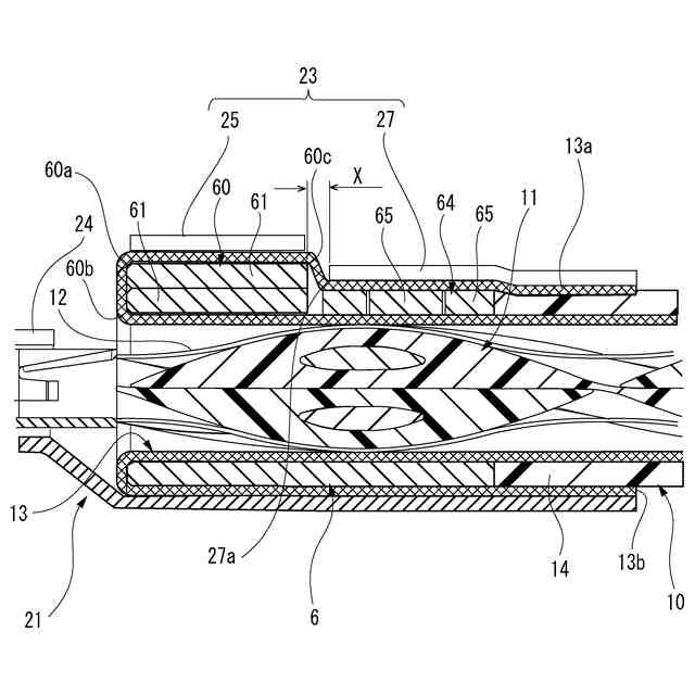 前記ケーブルの端部側に位置してオーバーラップ状に加締められた前圧着部と、前記前圧着部の外形よりも小さい外形で前記前圧着部の奥側に位置する後圧着部とを有し、前記シースの端部から露出した前記編組の外周側に被せられるインナースリーブと、