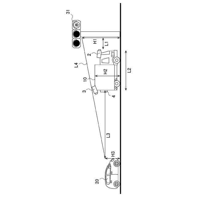 図3は、後続車両から信号機が見える状況における、図1に示すドライブレコーダを搭載した自車両と、後続車両と、信号機と、の関係を説明するための説明図である。