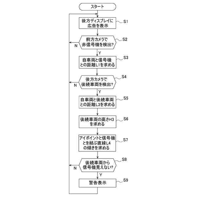 (前記信号機の高さ-前記後続車両の前記運転者の目の高さ)/(前記自車両と前記後続車両との距離+前記自車両の長さ+前記自車両と前記信号機との距離)を前記直線の傾きとして求め、