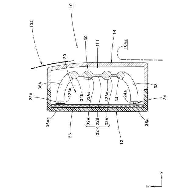 【解決手段】導光体30として、後面に複数の反射素子32Asが形成されたメイン導光部32と、柱状に形成された第1および第2サブ導光部34U、34Lとが、メイン導光部32を中心にして並列に配置された状態で車幅方向に延びるように配置された構成とする。また、1対の第1発光素子22Aおよび1対の第2発光素子24が、それぞれ車幅方向の2箇所に配置された構成とする。その上で、導光体30として、左右1対の第1発光素子22Aからの出射光を車幅方向外側へ向けて第1サブ導光部34Uに入射させるための左右1対の第1光入射部36Aと、左右1対の第2発光素子24からの出射光を車幅方向内側へ向けて第2サブ導光部34Lに入射させるための左右1対の第2光入射部38とを備えた構成とする。