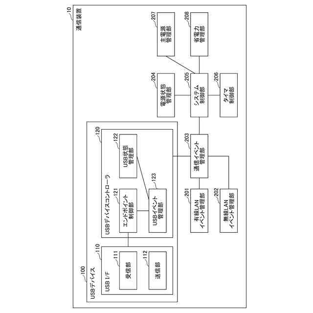 【解決手段】通信装置は、USBインタフェースを有するUSBデバイスを備え、前記USBインタフェースを介して他の装置と通信可能な通信装置であって、前記USBデバイスの動作状態を管理するUSB状態管理部と、前記通信装置の電源状態を管理する電源状態管理部と、前記USBデバイスが前記他の装置との通信を休止している動作状態が所定の時間継続した場合、前記通信装置を現在の電源状態より消費電力が少ない電源状態への移行を制御する状態制御処理を実行するシステム制御部と、を有する。