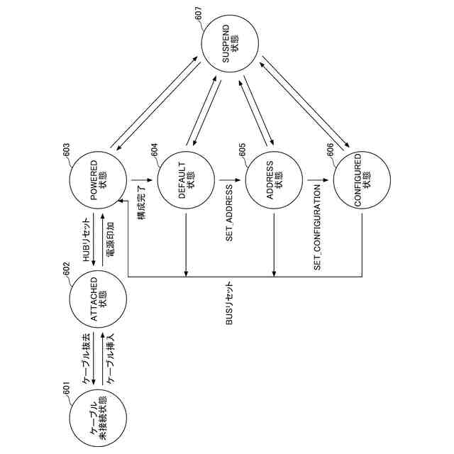 第1の実施形態に係る通USBデバイスの状態遷移の例を示す図である。
