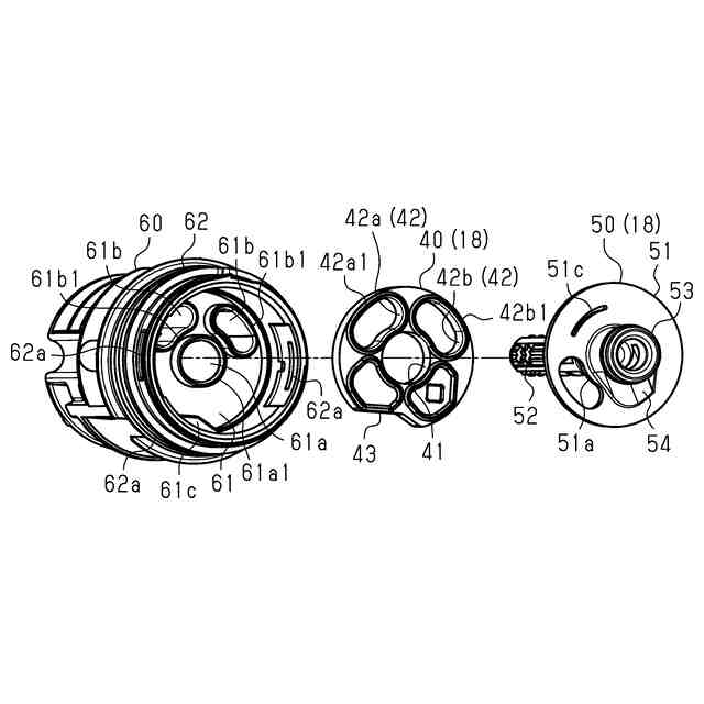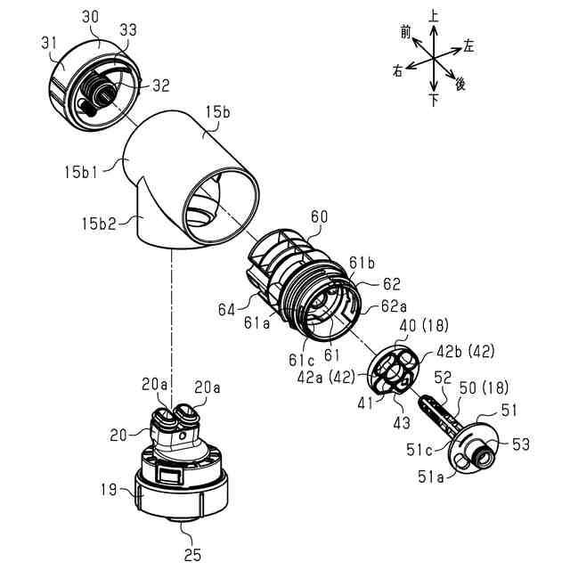 図13(a)、(b)、図14に示すように、筒状頭部72の内部に、複数の流出孔を有する隔壁74と、隔壁74の上流側に装着される弁座パッキン75と、弁座パッキン75の上流側に配置される回転体76を備えることを記載している。回転体76に、回転体76を回転させる回転軸(図示省略)が連結されている。また、回転軸にハンドル73が連結されている。ハンドル73を操作することによって、回転体76を回転操作することができる。