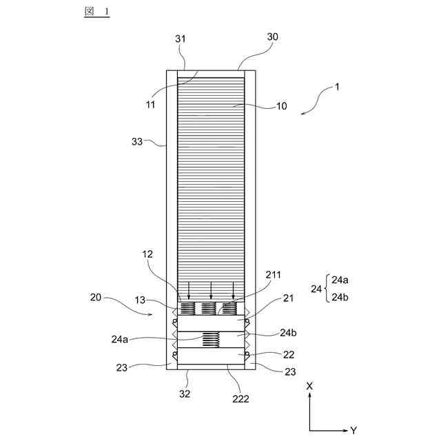 図1は、本発明の実施形態に係る面圧付与機構を含む電池モジュールを模式的に示す断面図である。図1で示されるように、電池モジュール1は、複数の全固体電池が積層して構成される積層体10と、面圧付与機構20と、モジュールケース30とを備える。図1では、X軸は、全固体電池が積層する積層方向である。Y軸は、全固体電池の面方向であって、X軸に対して垂直方向である。電池モジュール1は、ひとつに限らず、複数備えることとしてもよい。