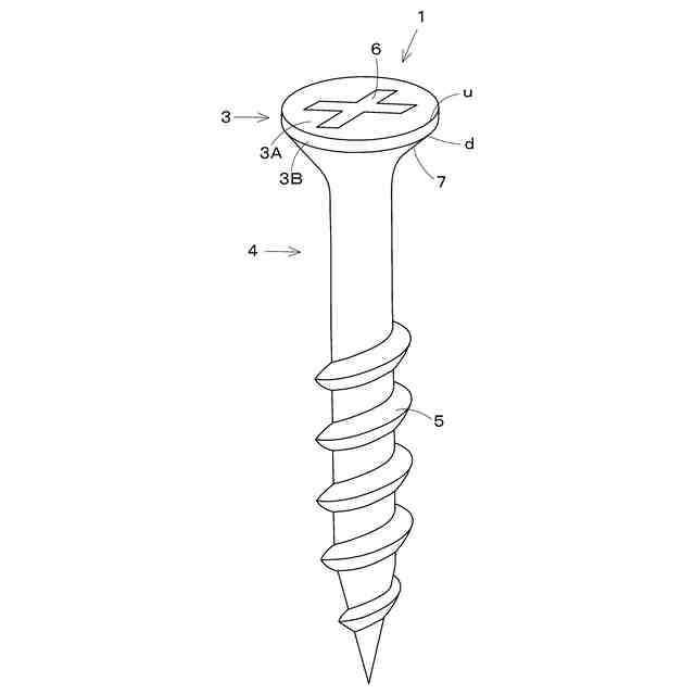 前記木ねじは、頭天に十字穴が形成され、頭部の下縁と軸とを繋ぐ顎部が円錐形に形成されている。そして、頭部の外周面が下縁から上縁までストレート円でなく、テーパ面等の外径が変化する形状になっている。