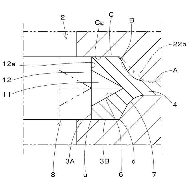 前記顎成形座部(B)の拡大側端部から入口外方向へ頭部(3)の径外方向流動を規制する内周面(Ca)を有する頭部外周壁部(C)が突出形成されており、この頭部外周壁部(C)の内周面(Ca)は頭部(3)の外周面(3B)が下縁(d)から上縁(u)までストレート円に形成するべくストレート円に形成されていることを特徴とする木ねじ成形型。
