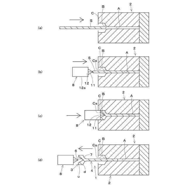 軸挿入孔22aに寸切りの棒素材を挿入し、十字穴成形体23を押圧して棒素材を径外方向及び軸方向に流動させながら、軸挿入孔22aの入り口側の円錐形顎成形座部22bに押し付けて顎部を形成し、かつ円錐形顎成形座部22bの外側で棒素材を径外方向に流動させながら頭部21及び十字穴を形成している。